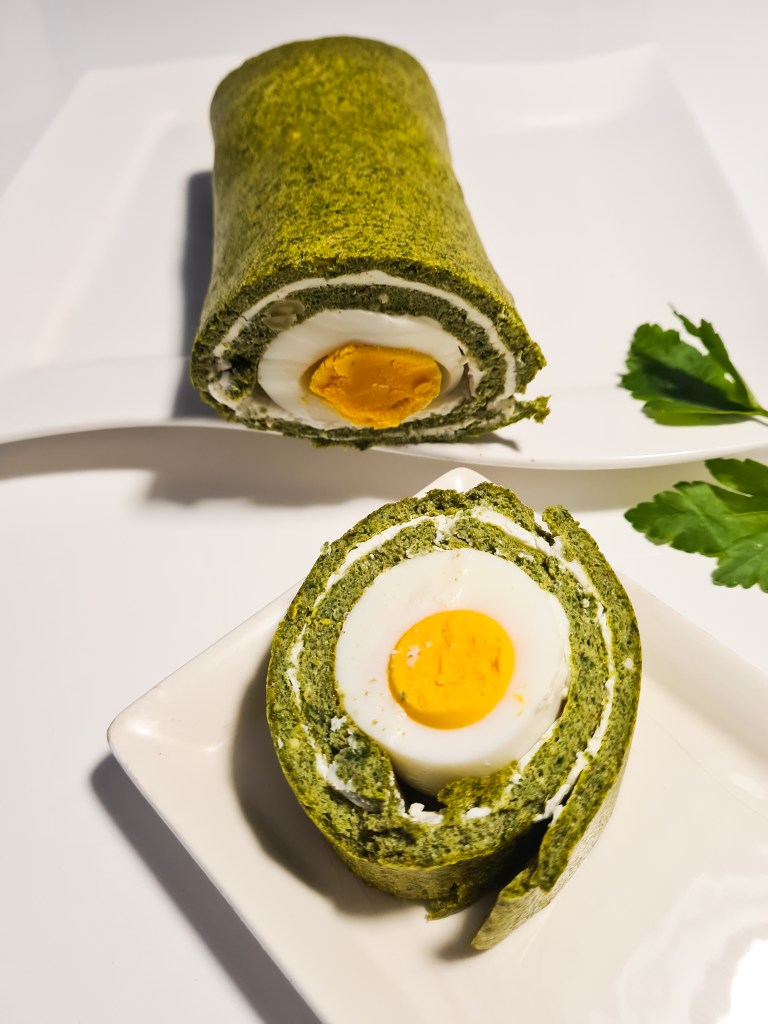 11. Kuhana jaja očistite od ljuski i posložite ih na rub kraće strane rolade.